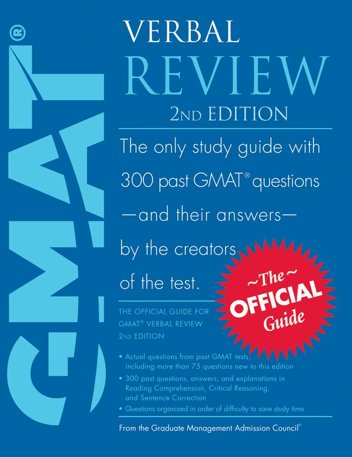 The only official verbal review for the GMAT from the creators of the testAnyone preparing for the Graduate Management Admission Testr (GMAT) knows it's important to study with the experts. With The Official GMAT Verbal Review, 2nd Edition, you'll get questions, answers, and explanations straight from the source. The only official verbal review for the GMAT Exam, this book targets your study and helps you improve your verbal skills by focusing on your ability to read and comprehend written material, to reason and evaluate arguments, and to correct written material to conform to standard English. Inside, you'll find 300 actual questions from past GMAT tests, including 75 questions new to this edition Sections on Reading Comprehension, Critical Reasoning,